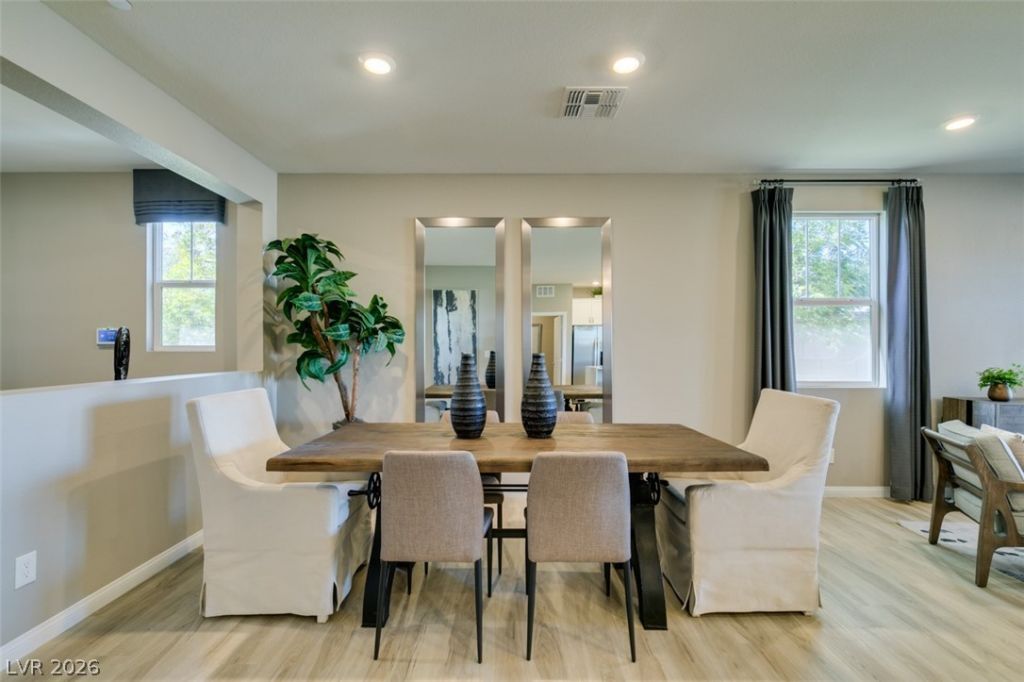 Welcome to this beautifully furnished 3-bedroom home in the sought-after community of Inspirada, offering refined comfort and effortless style. Upon entry, you're greeted by an open-concept layout that seamlessly connects the dining area, kitchen, and living room, perfect for entertaining and everyday living. The kitchen features sleek stainless steel appliances and an oversized island with breakfast bar seating and generous counter space. Natural light fills the living room, where sliding glass doors open to a private backyard complete with patio furniture and peaceful views. All bedrooms are spacious and bright, while the primary suite offers a spa-like bath with dual sinks, a walk-in shower, a separate soaking tub, and a large walk-in closet with ample storage.